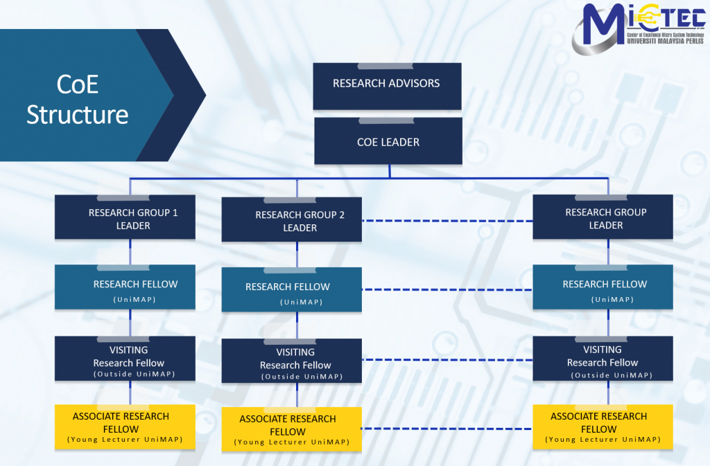 Leadership & Organisation COE Head Assoc Prof Dr Asral Bahari Jambek COE Secretariat Dr Noraini Othman Assoc Prof Dr Nur Juliana Juhari Dr Suriati Suhaimi Dr Nursabirah Jamel Dr Norhayati Sabani COE Research Group Leader Dr Mohd Rosyidi Zakaria Dr. Nurul Izza Mohd Nor Assoc. Prof. Ir. Dr. Sohiful Anuar Bin Zainol Murad COE Organisation